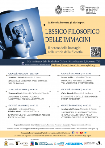 Inaugurerà il ciclo la conferenza di Massimo Giuliani che esaminerà il divieto ebraico di rappresentare Dio. Francesca Masi, protagonista del secondo incontro, si occuperà dell’immagine, o fantasma, come elemento fondamentale dell’esperienza onirica descritta da Aristotele nei suoi trattatelli sul sogno e sui sogni. Il terzo appuntamento sarà invece dedicato al dialogo tra uno storico dell’arte, Aldo Galli, e uno storico della filosofia, Fabrizio Meroi, su Leon Battista Alberti, artista e pensatore del Rinascimento italiano, al quale dobbiamo acute riflessioni sulle immagini. Il ruolo dell’immagine all’interno dei processi cognitivi e come movente delle azioni umane sarà chiarito dall’intervento di Mauro Nobile, che traccerà un breve excursus da Aristotele a Wittgenstein. Sviluppando un discorso a cavallo tra filosofia e poesia, Carlo Salzani si occuperà dei modi di guardare all’alterità non umana caratteristici della tradizione occidentale, nonché della natura e della funzione dell’immagine nella vita “mentale” degli animali. Nell’ultima conferenza del ciclo, Mariagrazia Portera affronterà la delicatissima questione della salvaguardia del nostro mondo, la cosiddetta sfida ecologica, e applicherà un approccio estetico al tema della conservazione della biodiversità.