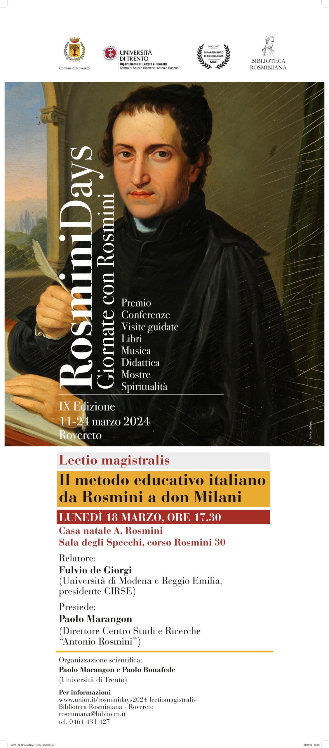 Lunedì 18 marzo 2024, alle ore 17.30, presso la Sala degli Specchi della Casa Natale di Antonio Rosmini, ha avuto luogo la Lectio magistralis 2024, dal titolo Il metodo educativo italiano da Rosmini a don Milani, tenuta da Fulvio de Giorgi (Università di Modena e Reggio Emilia, presidente CIRSE). Presiede l’incontro Paolo Marangon (direttore del Centro Studi e Ricerche “Antonio Rosmini”).